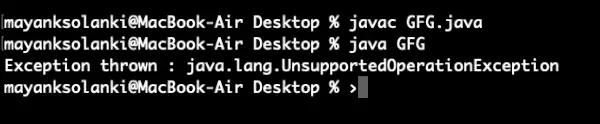 // Java Program to demonstrate asList() method> // Which returns fixed size list and> // throws UnsupportedOperationException> // if any element is added using add() method> // Importing required classes> import> java.util.*;> // Main class> public> class> GFG {> > // Main driver method> > public> static> void> main(String[] argv)> throws> Exception> > {> > // Try block to check for exceptions> > try> {> > // Creating Arrays of Integer type> > Integer a[] => new> Integer[] {> 10> ,> 20> ,> 30> ,> 40> };> > // Getting the list view of Array> > List list = Arrays.asList(a);> > // Adding another int to the list> > // As Arrays.asList() returns fixed size> > // list, we'll get> > // java.lang.UnsupportedOperationException> > list.add(> 50> );> > // Printing all the elements of list> > System.out.println(> 'The list is: '> + list);> > }> > // Catch block to handle exceptions> > catch> (UnsupportedOperationException e) {> > // Display message when exception occurs> > System.out.println(> 'Exception thrown : '> + e);> > }> > }> }> |